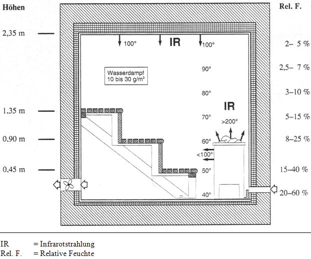 Charakteristisch für das Saunaklima ist ein starkes Temperaturgefälle. Bei einer Kabine mit dreistufiger Saunabank und einer Deckentemperatur von 100°C beträgt die Temperatur in Höhe der obersten Bank ca. 70°C, in Fußbodenhöhe nur noch etwa 40°C (s. Grafik).